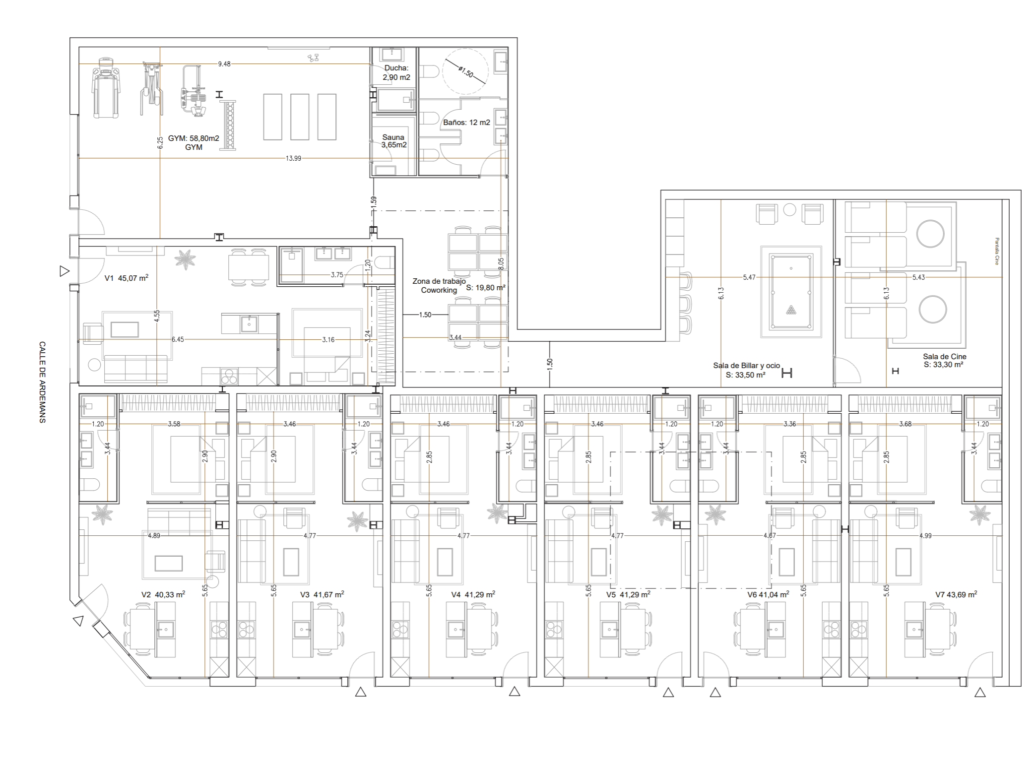 El proyecto se completa con una zona de coworking, una sala de cine privada, una sala de billar y ocio y un gimnasio con sauna y ducha, espacios concebidos para favorecer tanto el trabajo como el descanso.