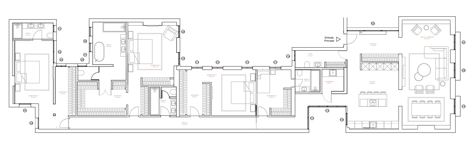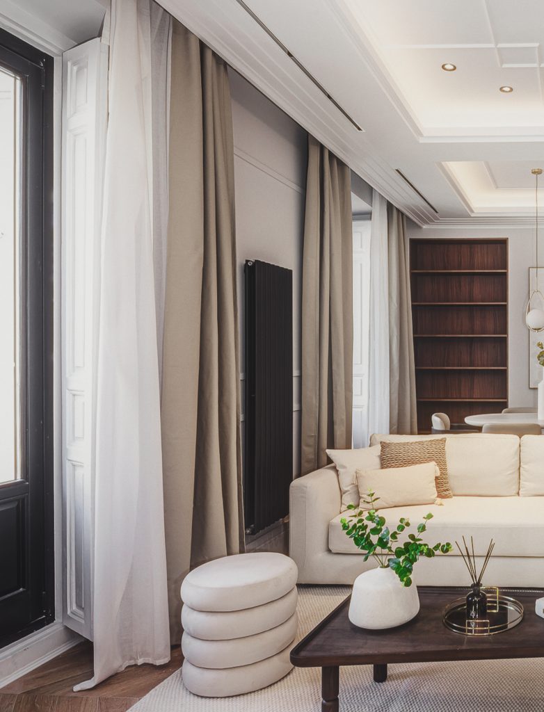 La vivienda fue completamente redistribuida para crear un espacio funcional y luminoso, manteniendo el carácter clásico de su arquitectura original.