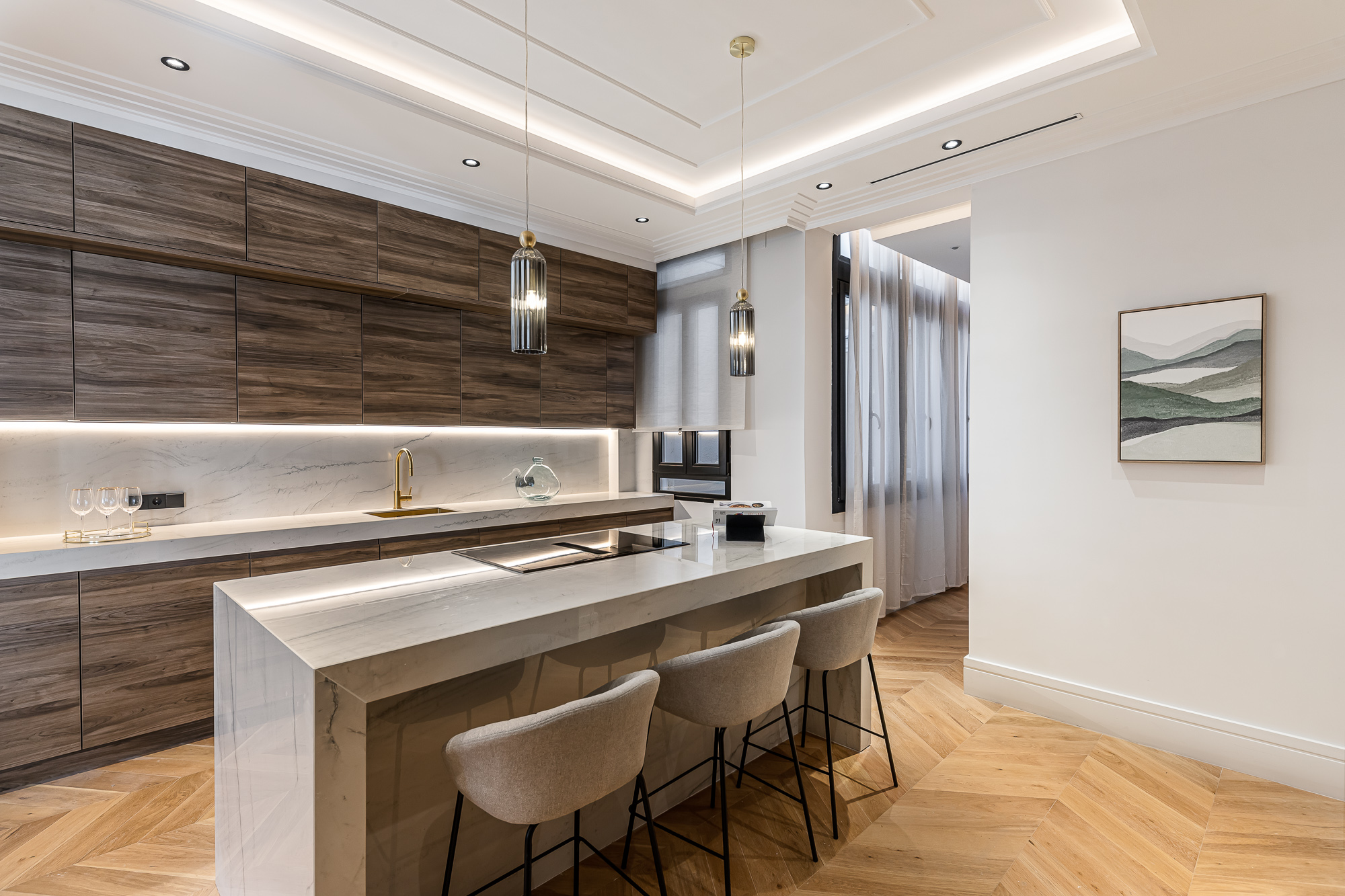 La cocina, abierta pero sutilmente delimitada, combina mármol natural y carpinterías en madera oscura, con iluminación cálida integrada.