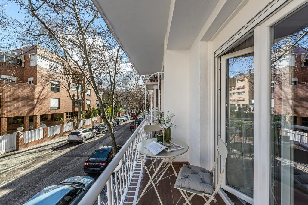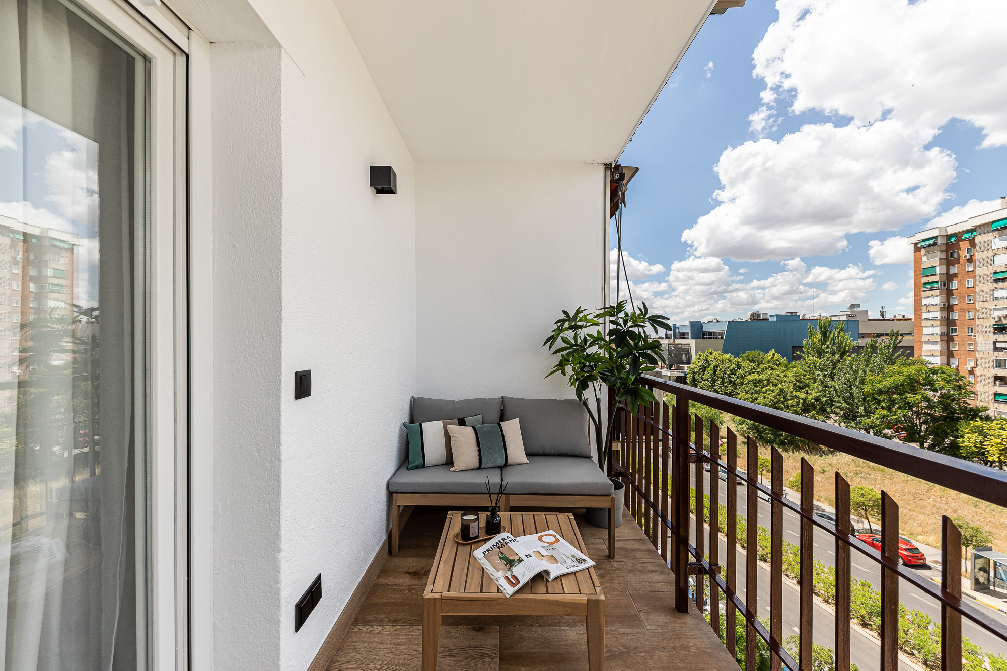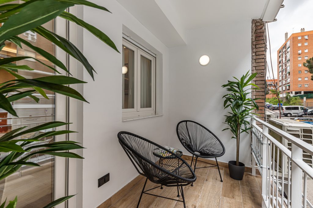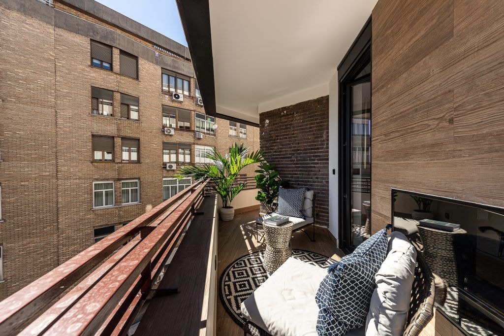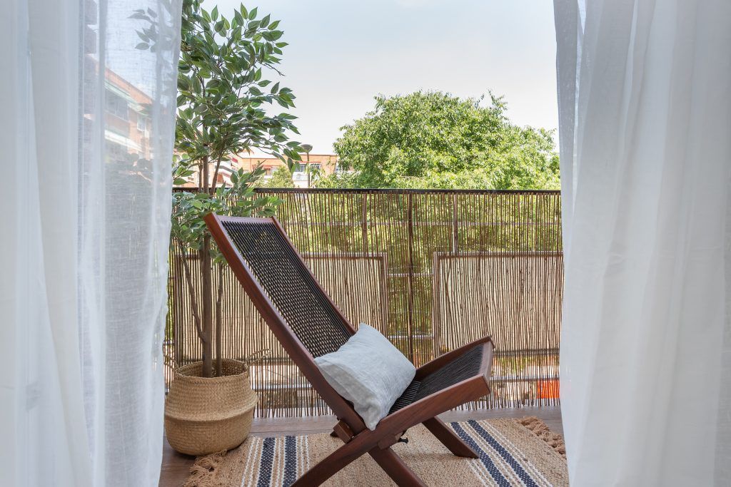 Si prefieres usar tu pequeña terraza como un espacio de relax, dos butacas anchas y bajas con muchos cojines, una alfombra de exterior, y una mesa en forma de taburete será lo que necesites como en Padilla 73.