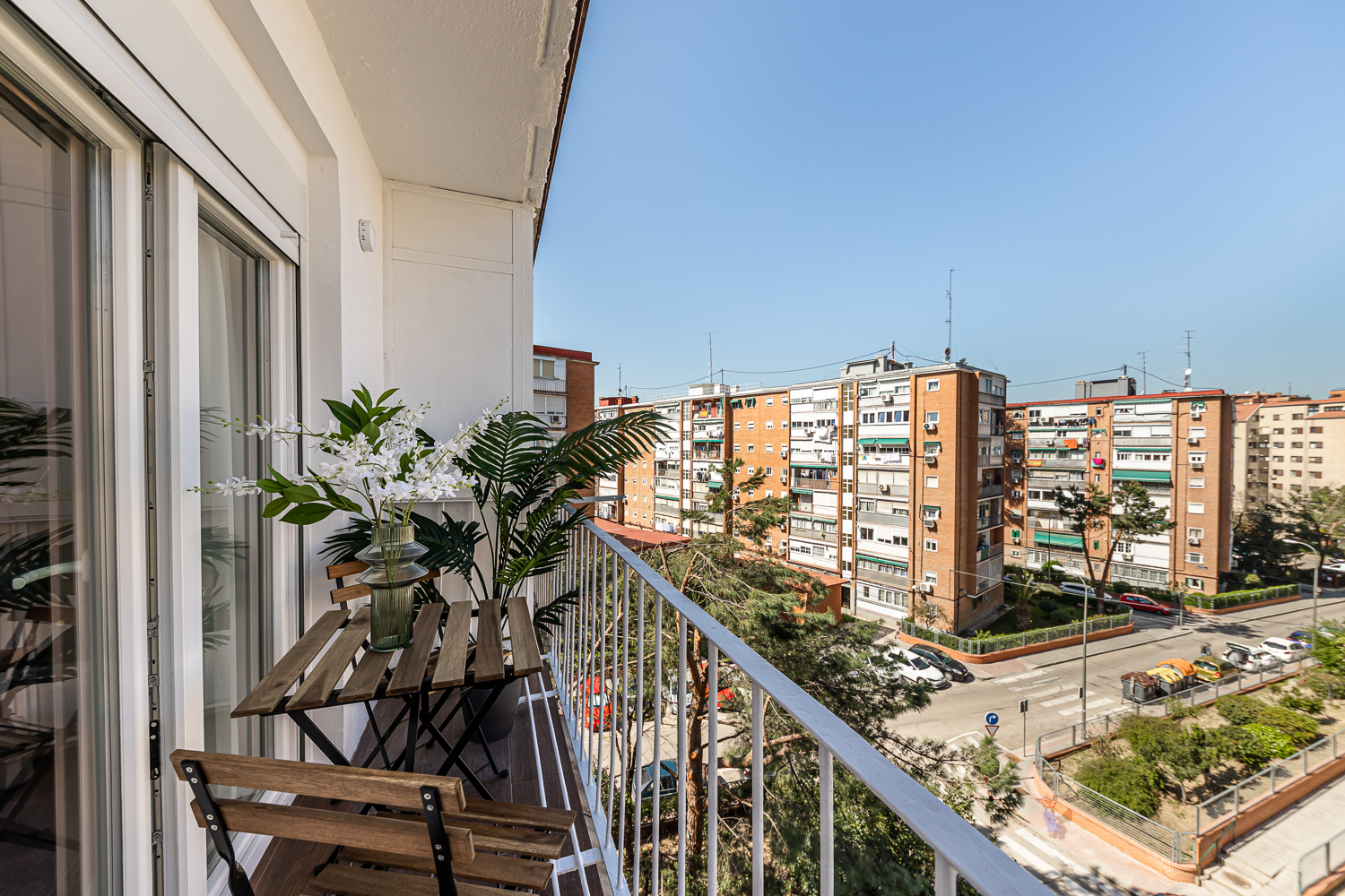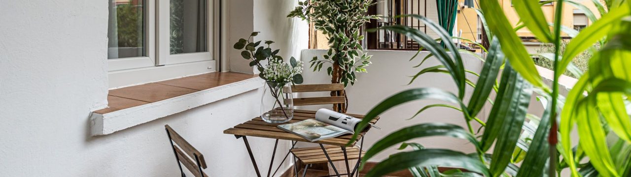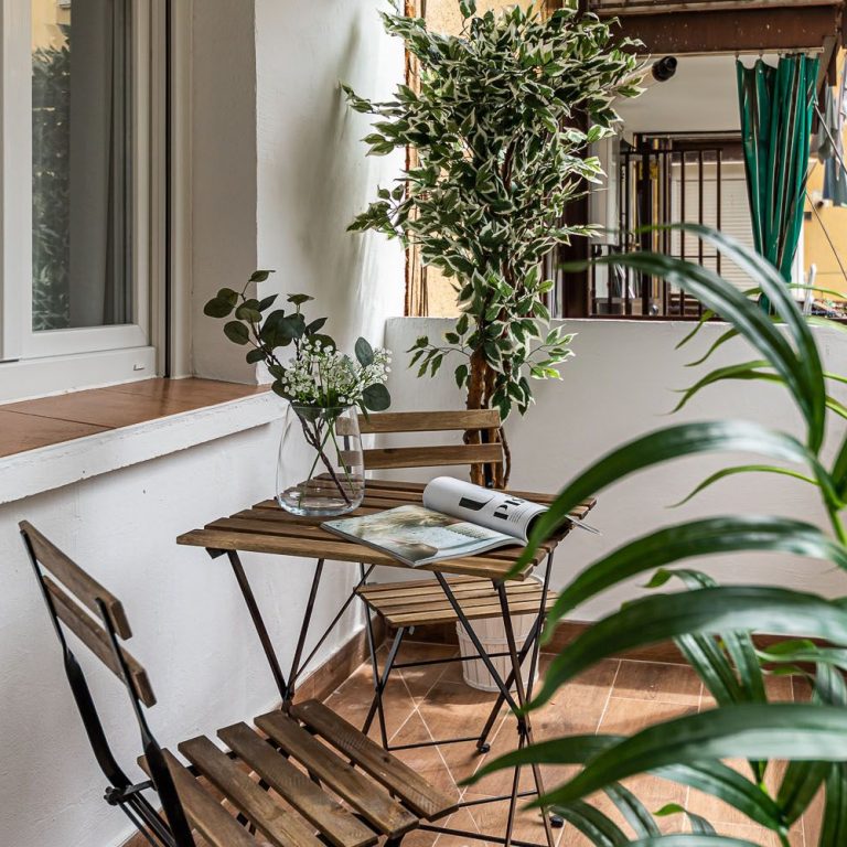 Si tu terraza es un poco más ancha puedes aprovechar para poner un banco además de sillas, será un rincón perfecto para sentarte a leer y pasar las noches de verano.