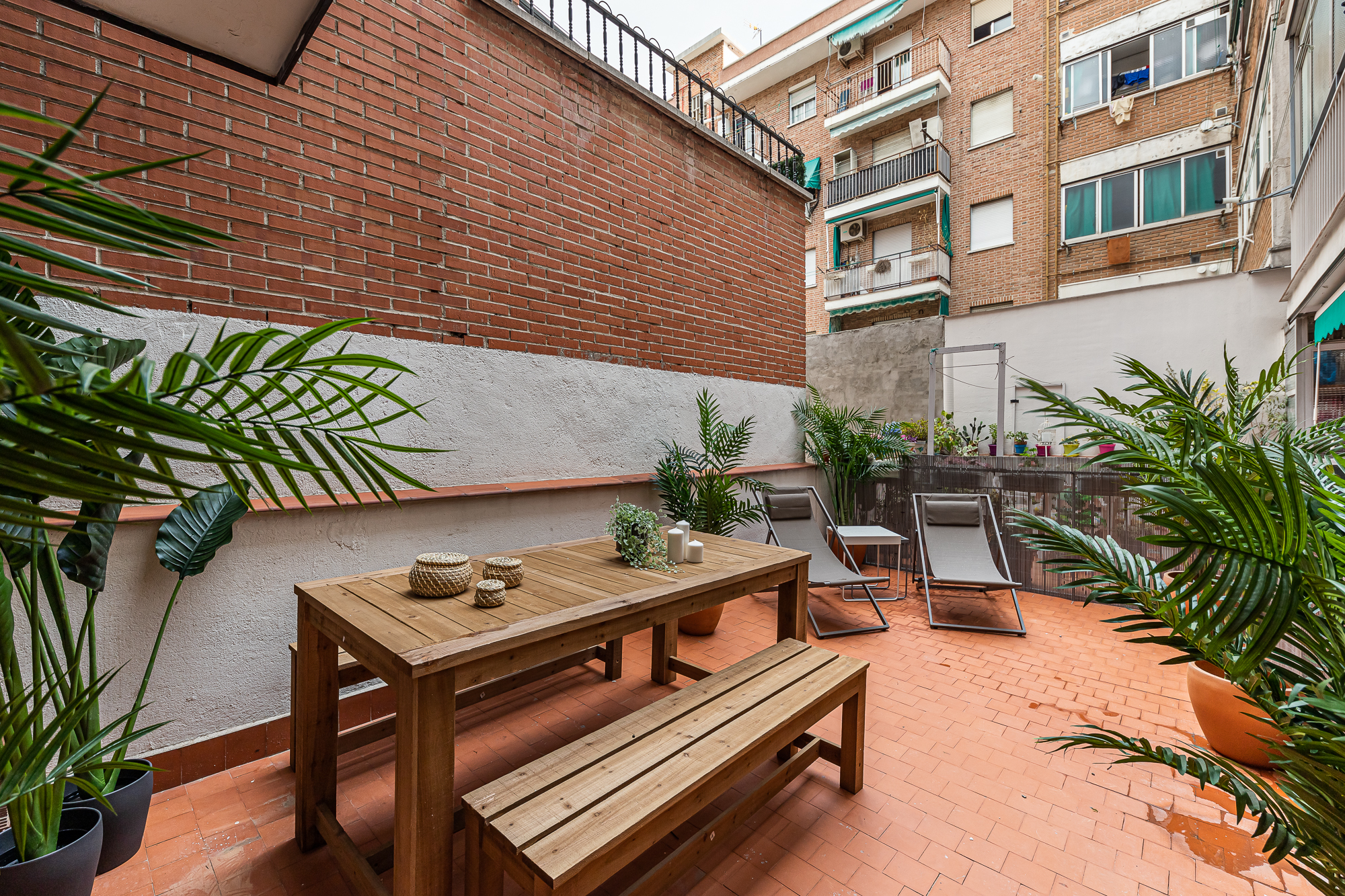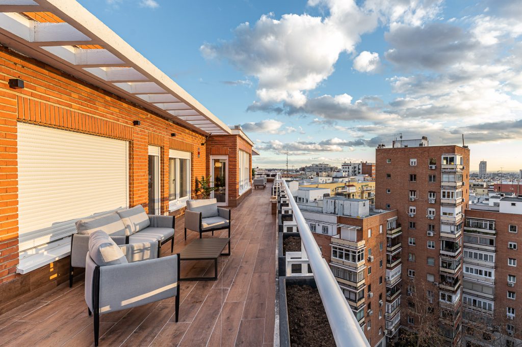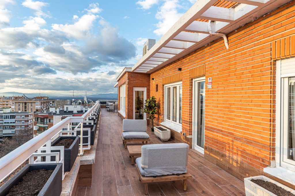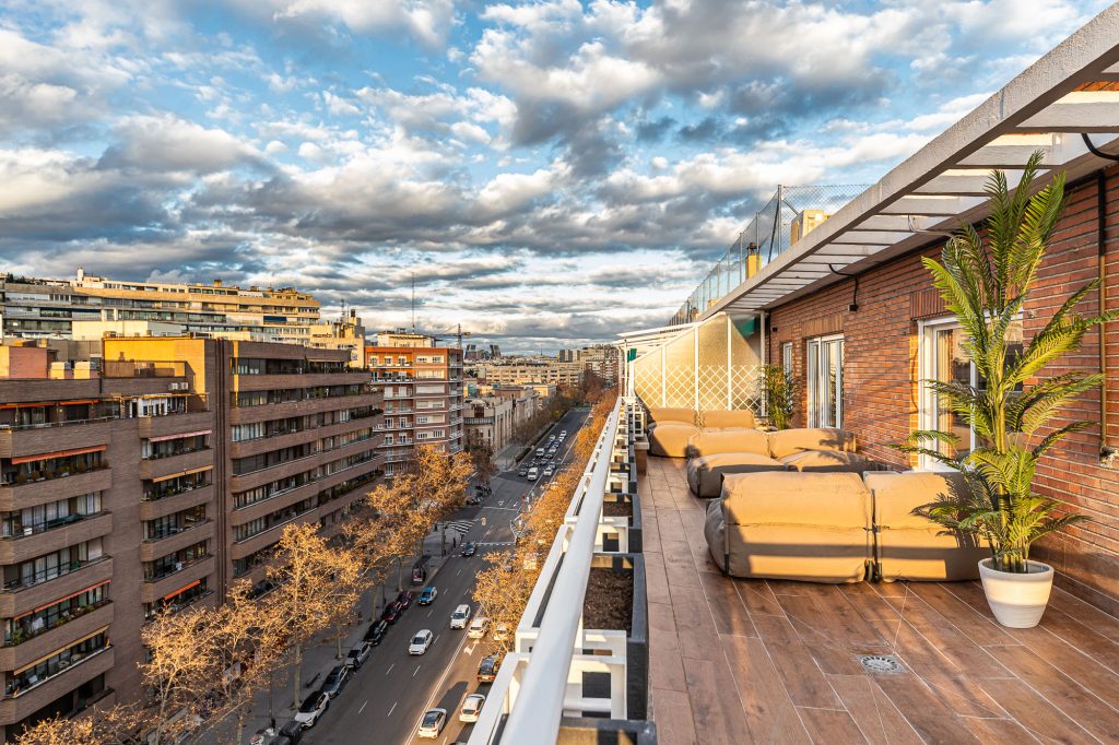 Si tienes la suerte de tener una terraza, pero para nada pequeña, podrás combinar todas las opciones anteriores. Mesa con sillas en la zona de la barbacoa. Un chill out con una mesa bajita y muchos pufs para relajarte y disfrutar como en esta terraza de Andrés Mellado 114.
