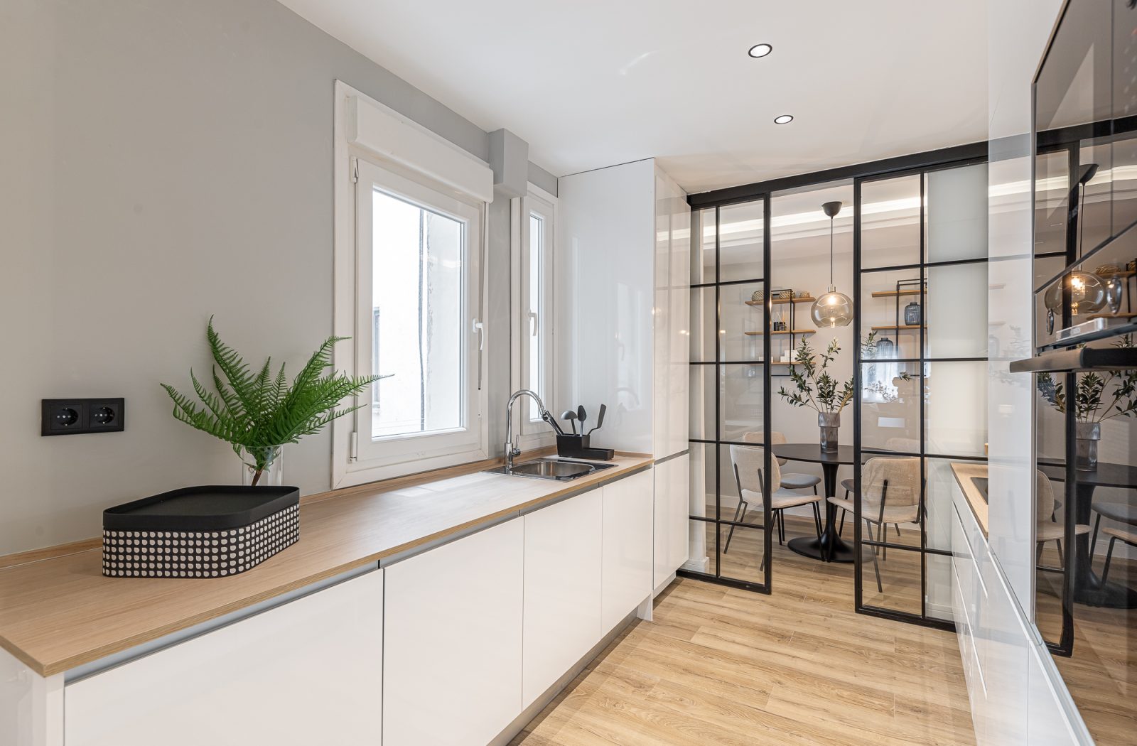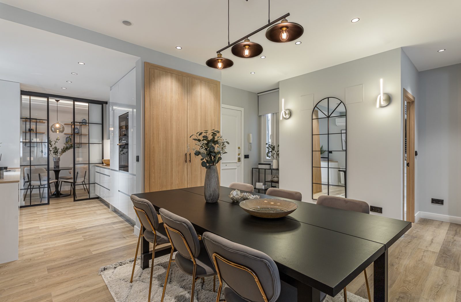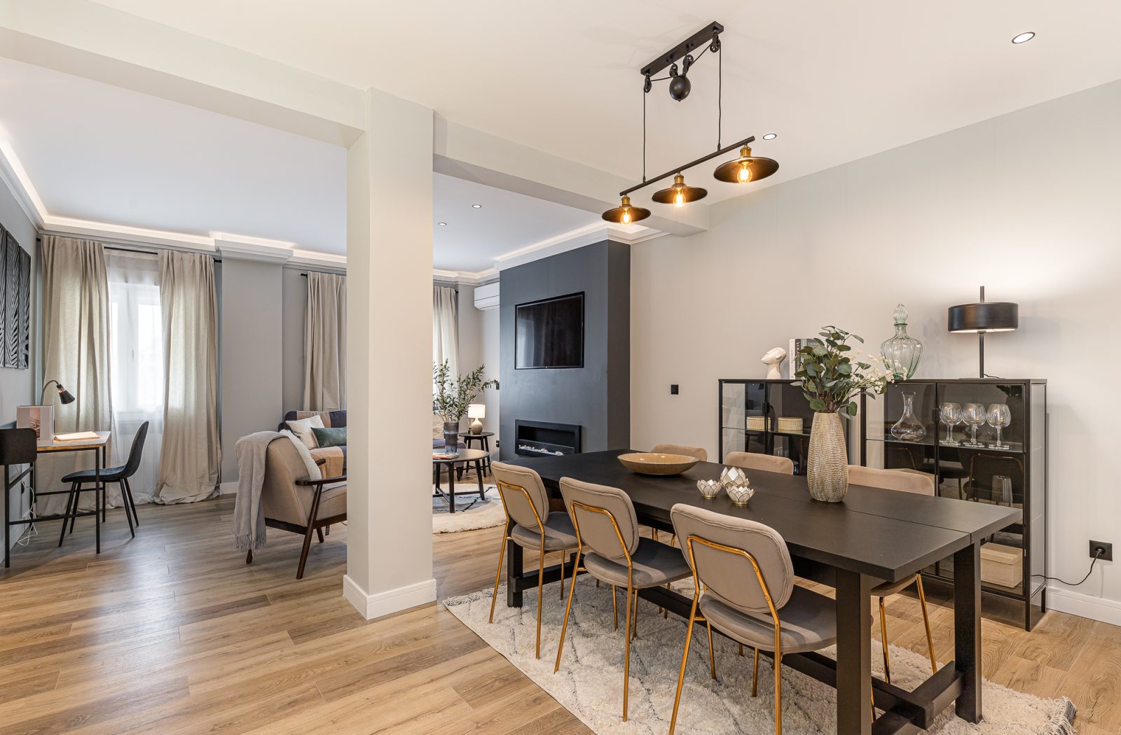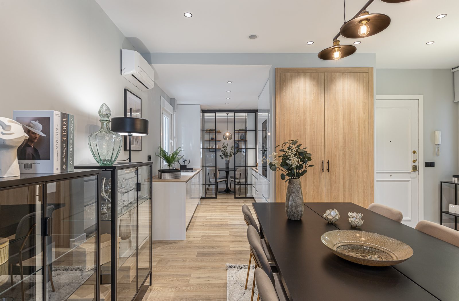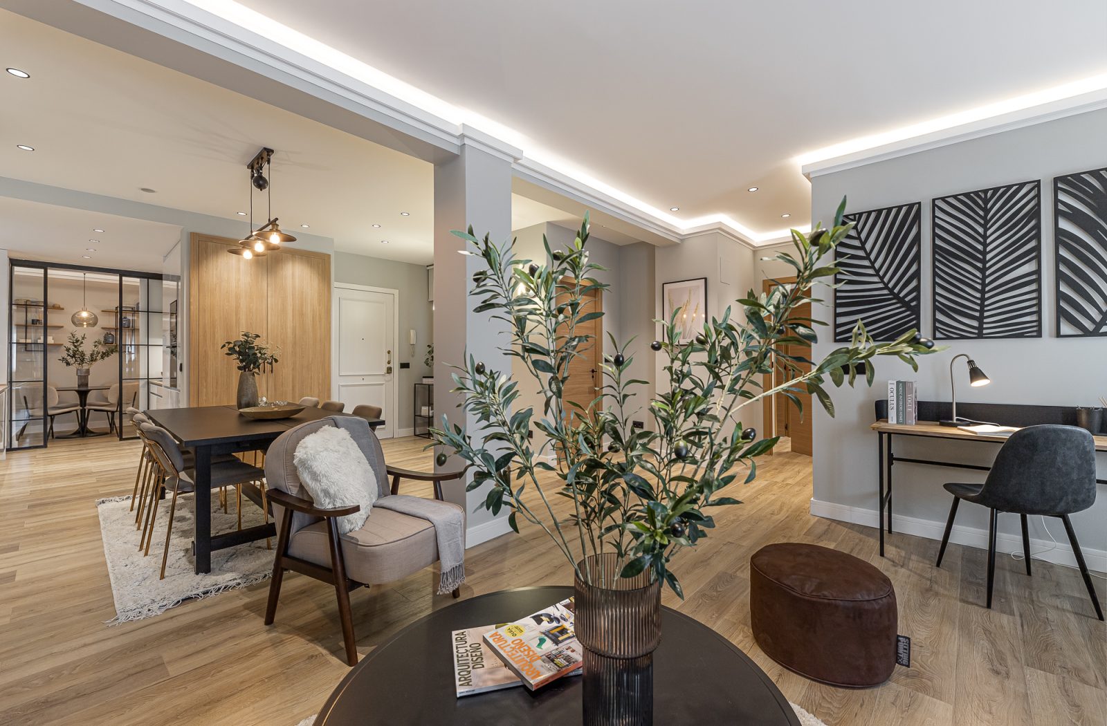 Reforma integral de un piso de 115 m², de 2 habitaciones, 2 baños y terraza, ubicado en la primera planta de un edificio residencial sito en el barrio de Cuatro-Caminos, distrito de Tetuán (Madrid).