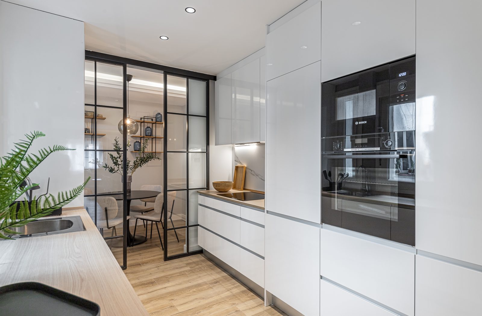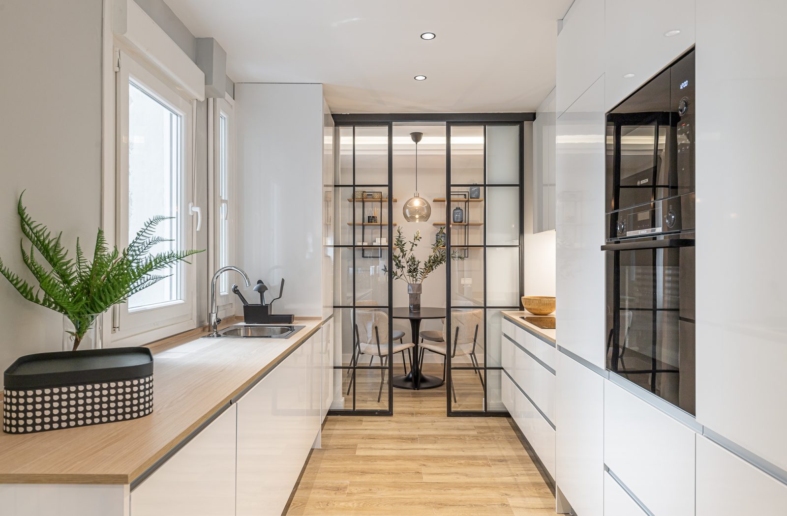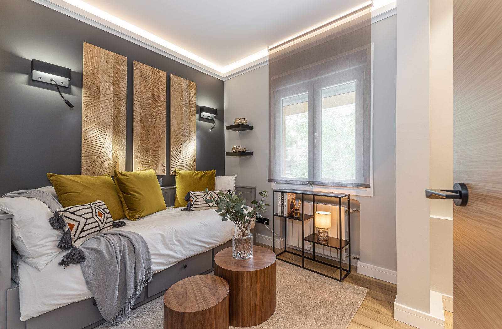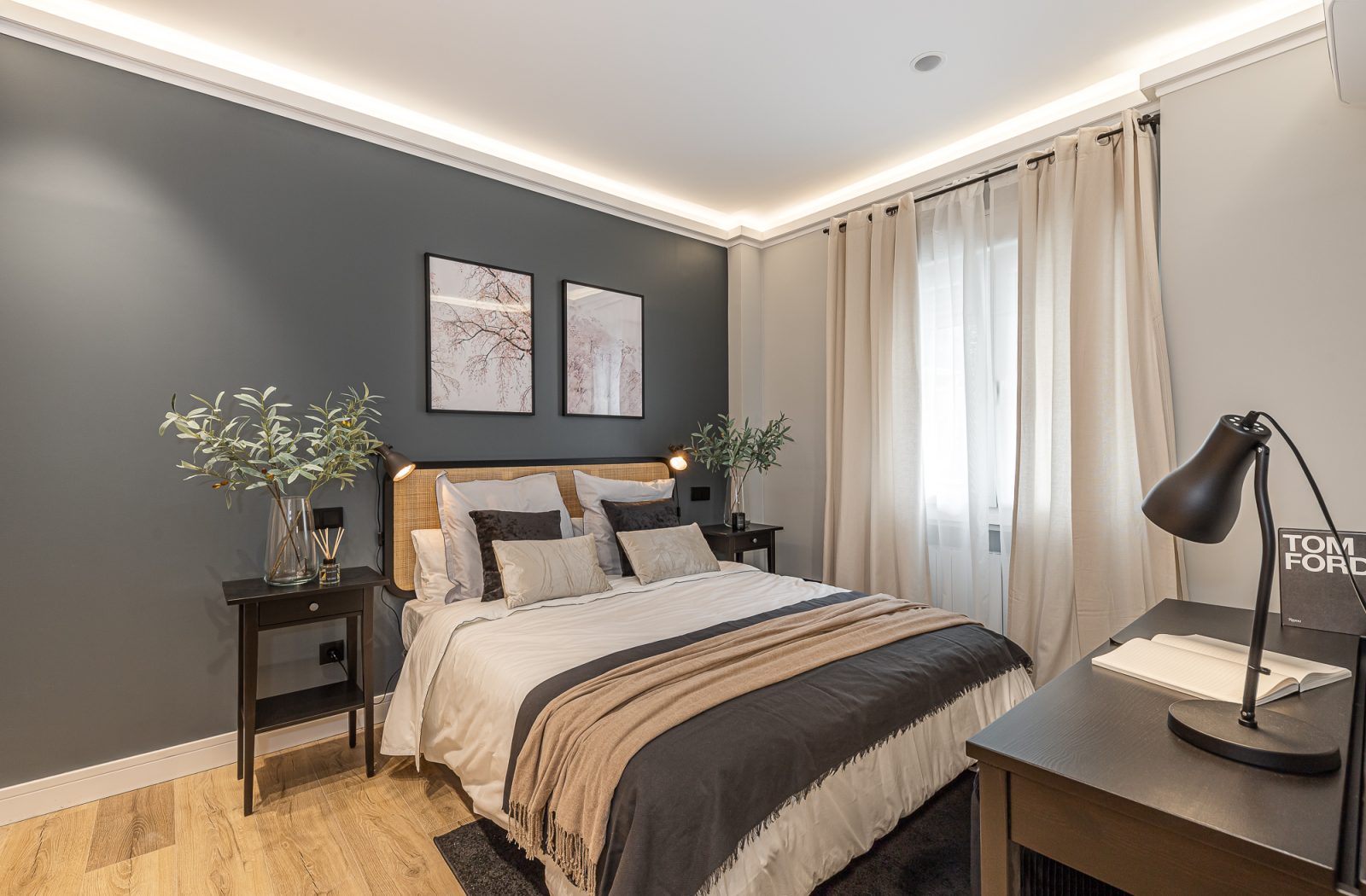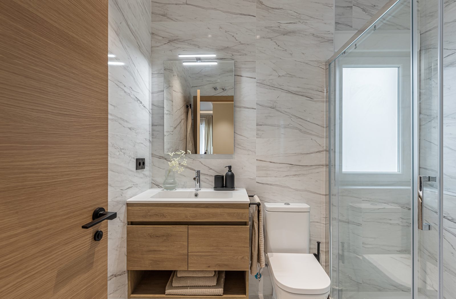 Reforma integral de un piso de 115 m², de 2 habitaciones, 2 baños y terraza, ubicado en la primera planta de un edificio residencial sito en el barrio de Cuatro-Caminos, distrito de Tetuán (Madrid).