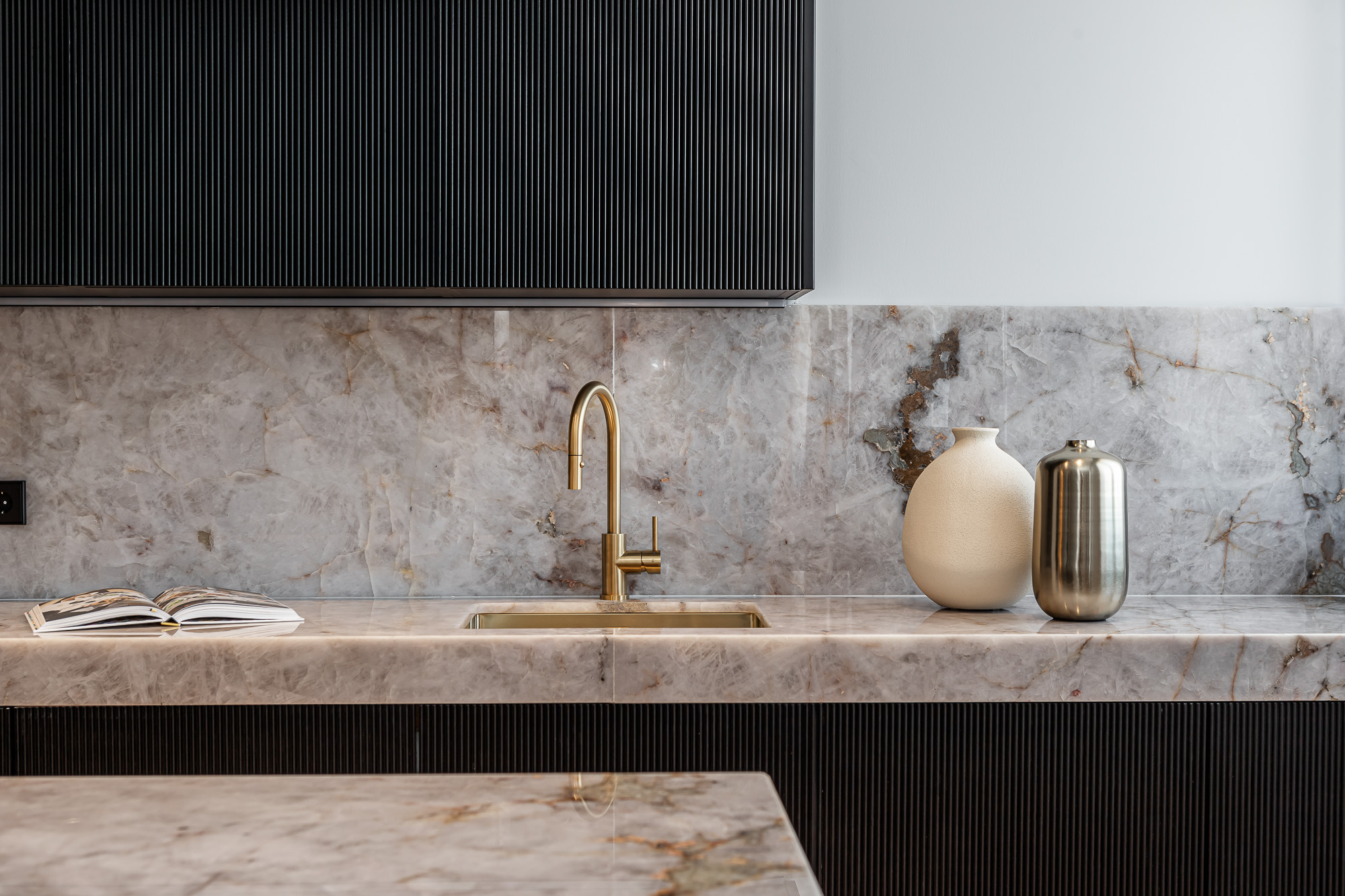 La cocina, abierta al salón mediante una composición de mármol y madera natural, actúa como corazón social de la vivienda. Las puertas ocultas conducen discretamente a zonas privadas y de servicio, generando una sensación de armonía y orden.