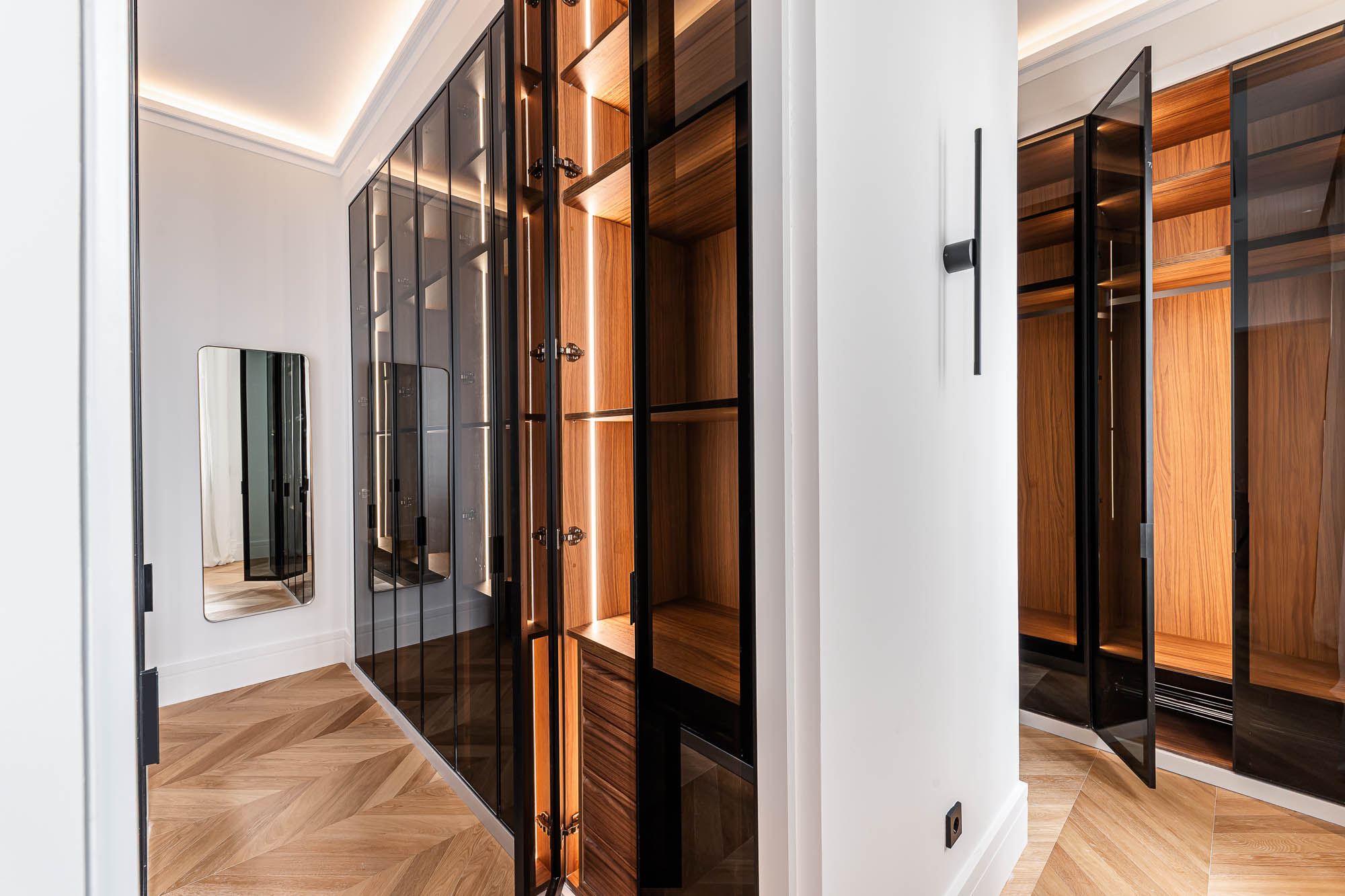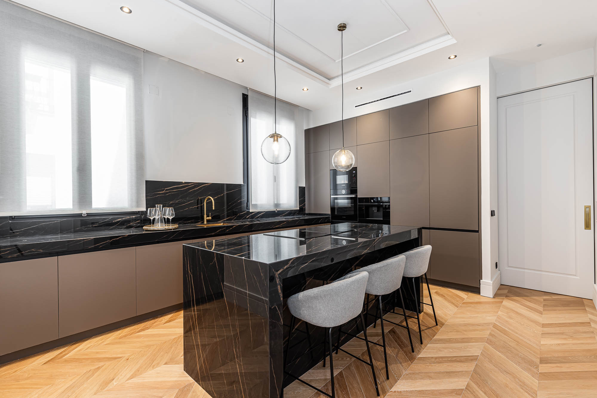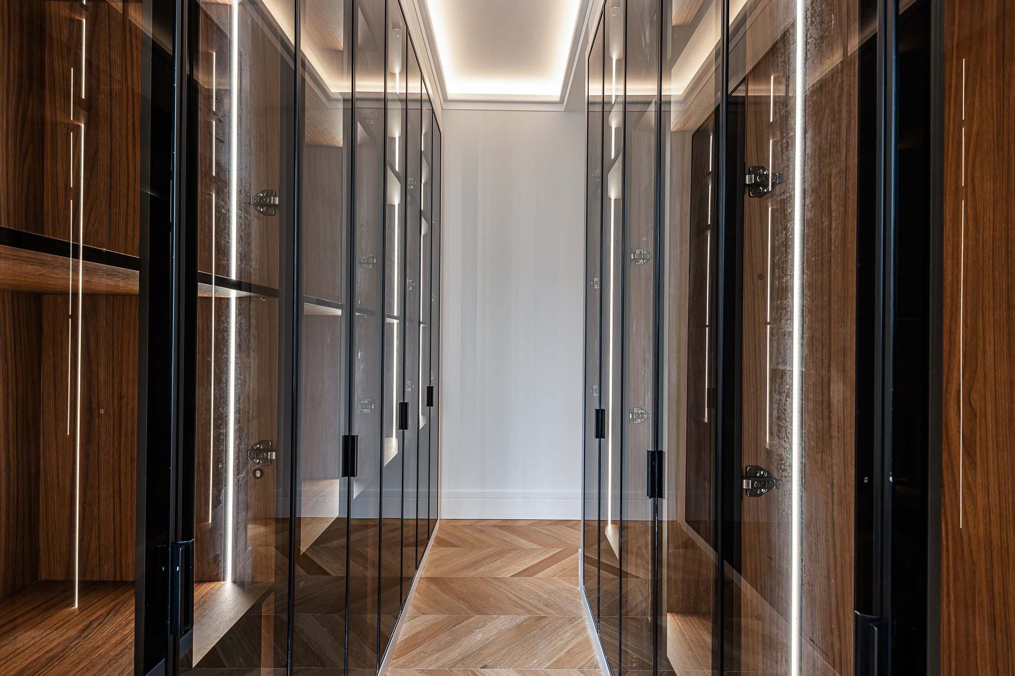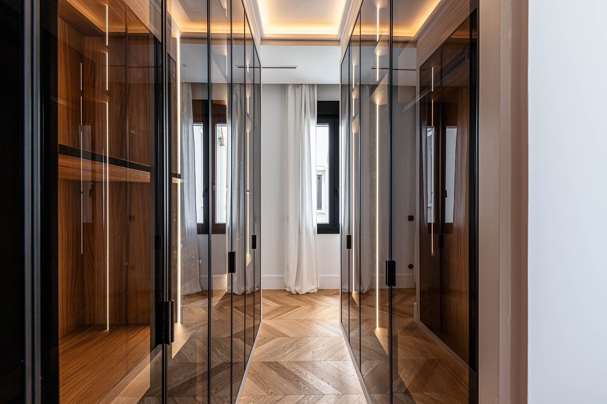 El proyecto destaca por su salón principal con biblioteca integrada, la continuidad visual entre cocina y comedor, y los vestidores en madera oscura con puertas de cristal ahumado, concebidos como espacios de diseño por sí mismos.