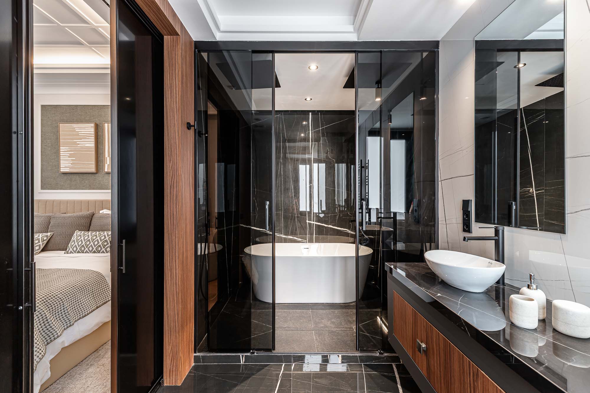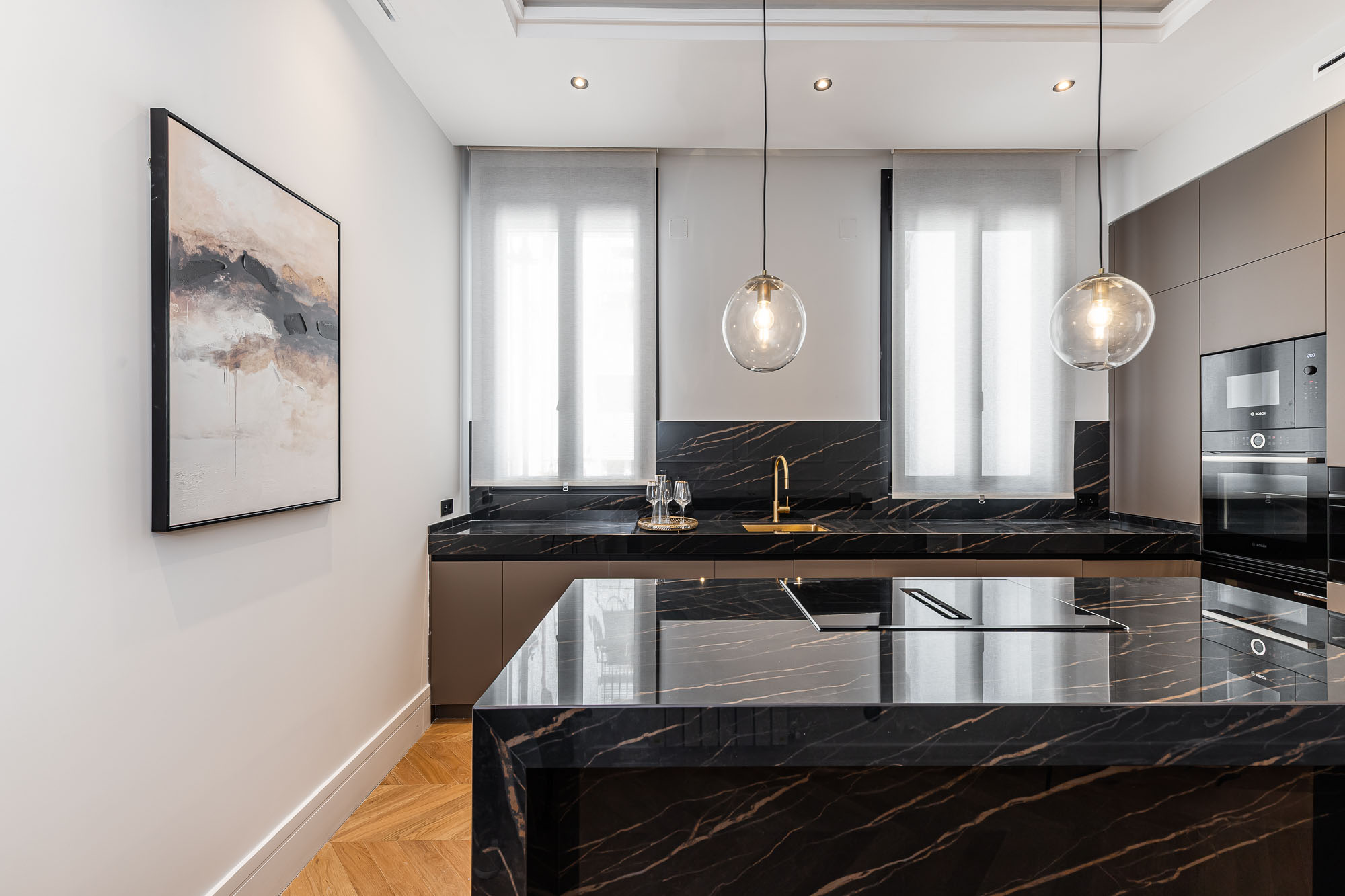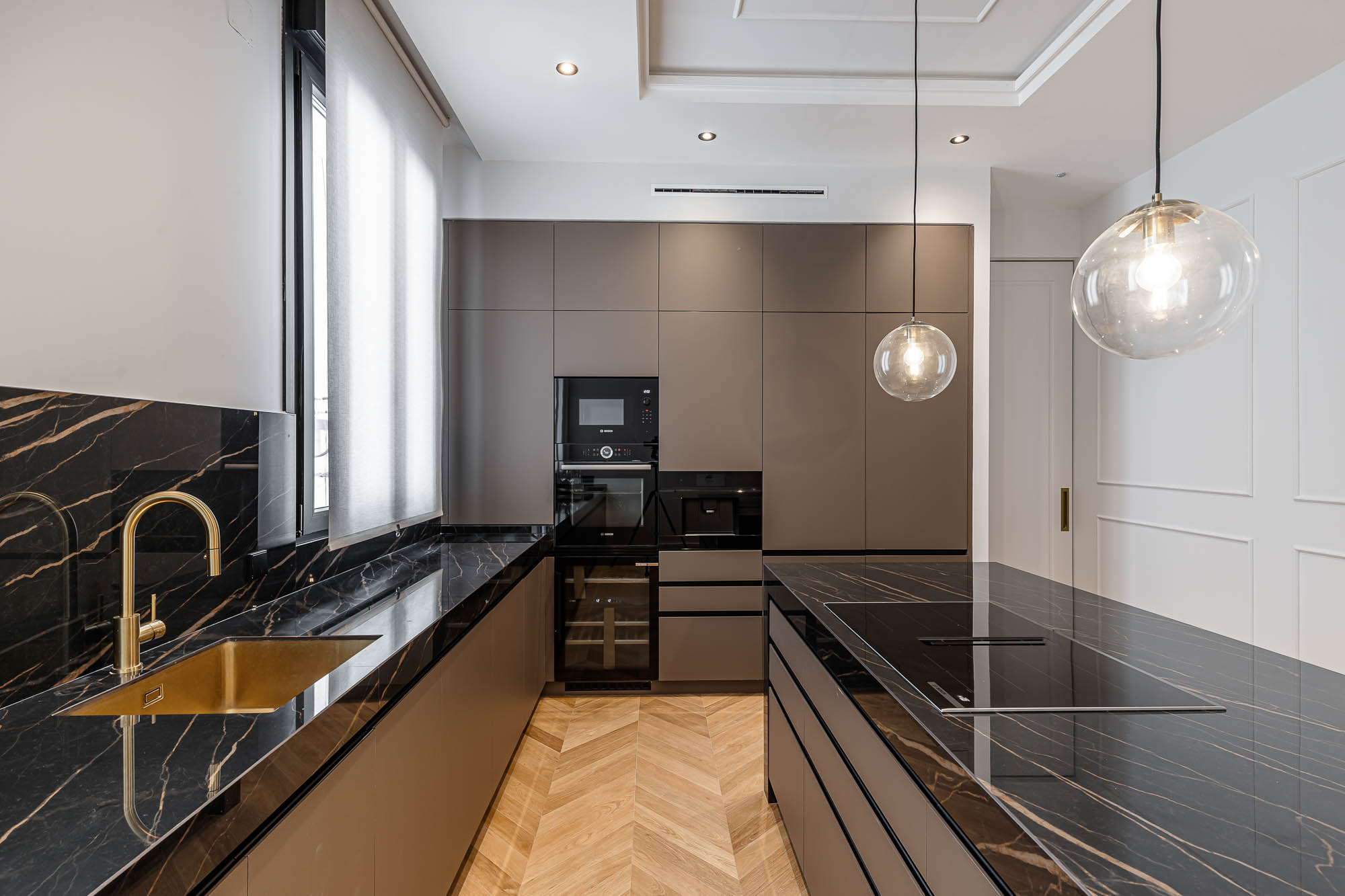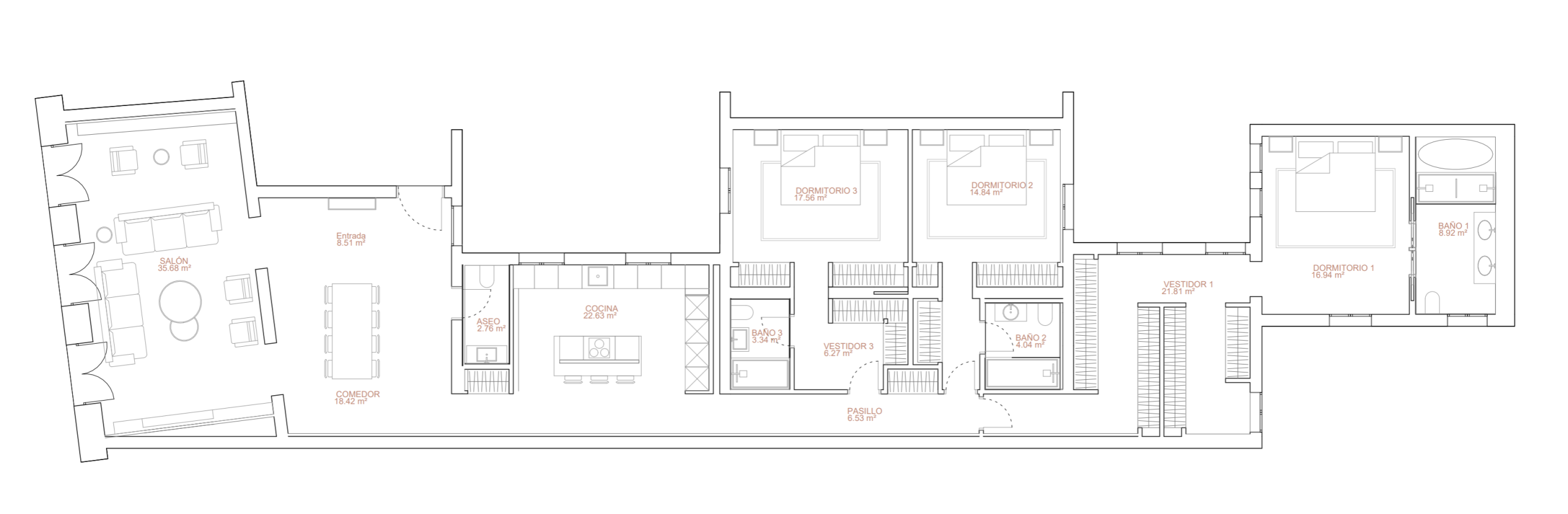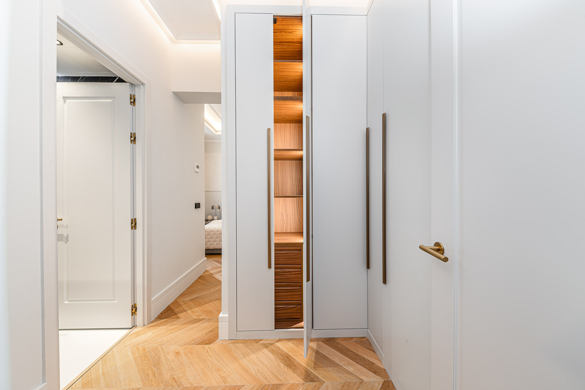 El proyecto destaca por su salón principal con biblioteca integrada, la continuidad visual entre cocina y comedor, y los vestidores en madera oscura con puertas de cristal ahumado, concebidos como espacios de diseño por sí mismos.