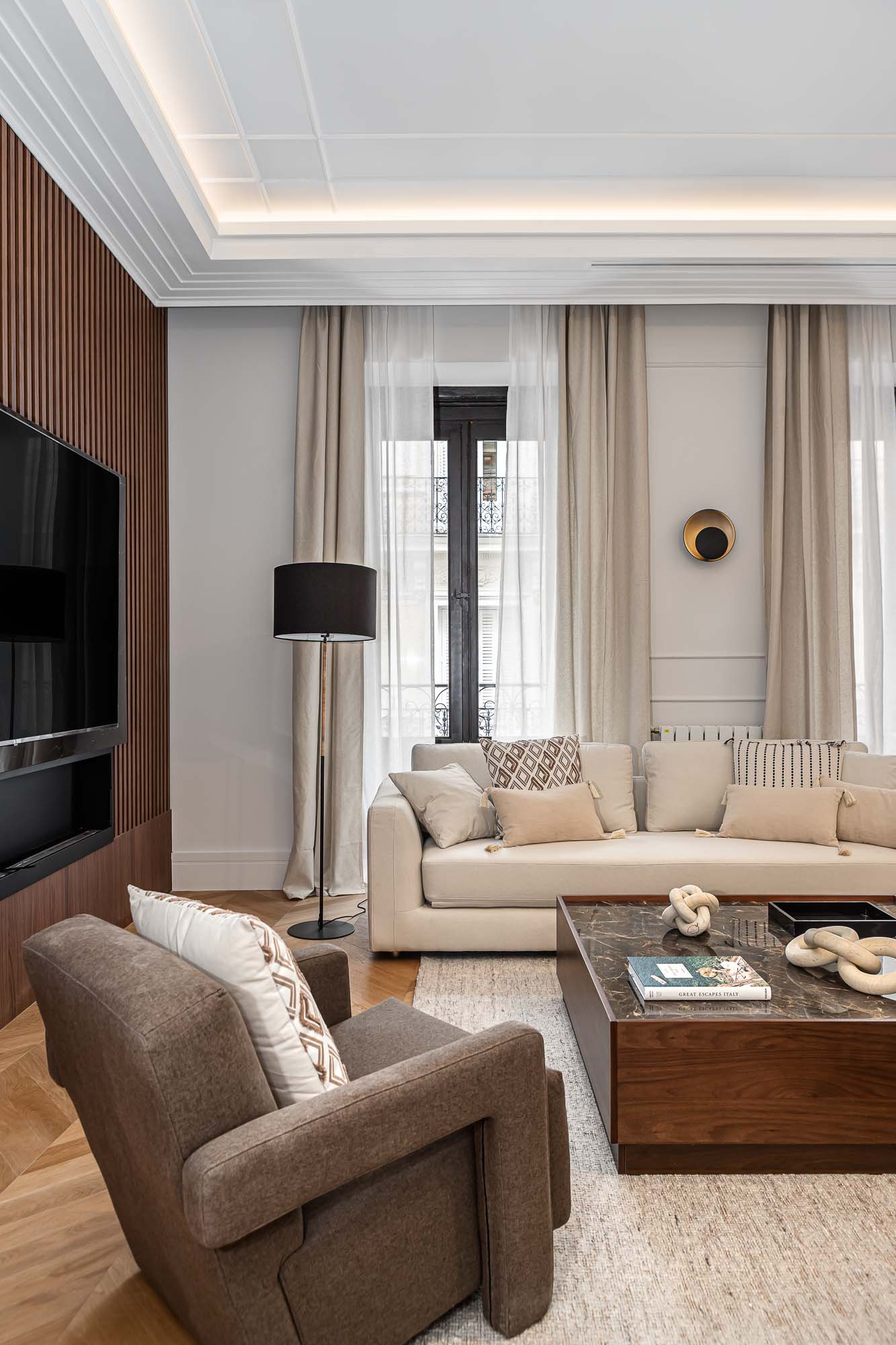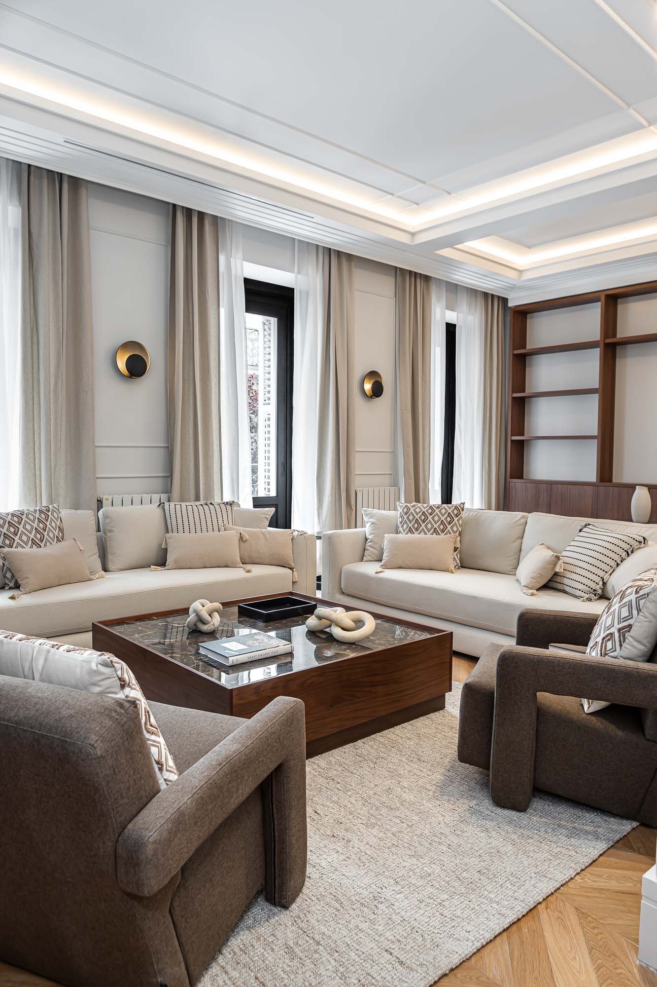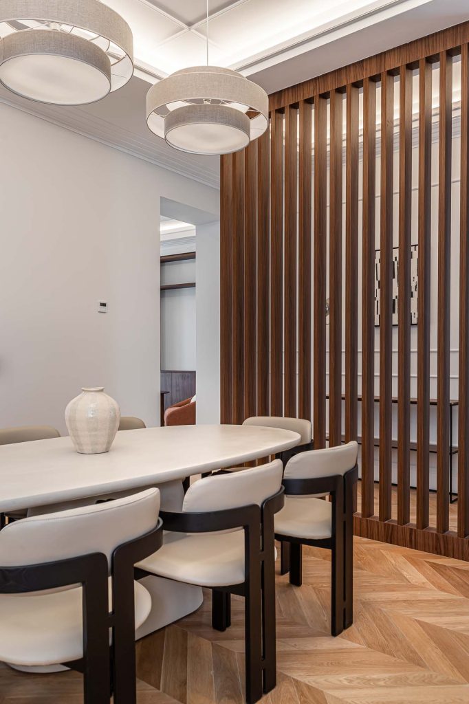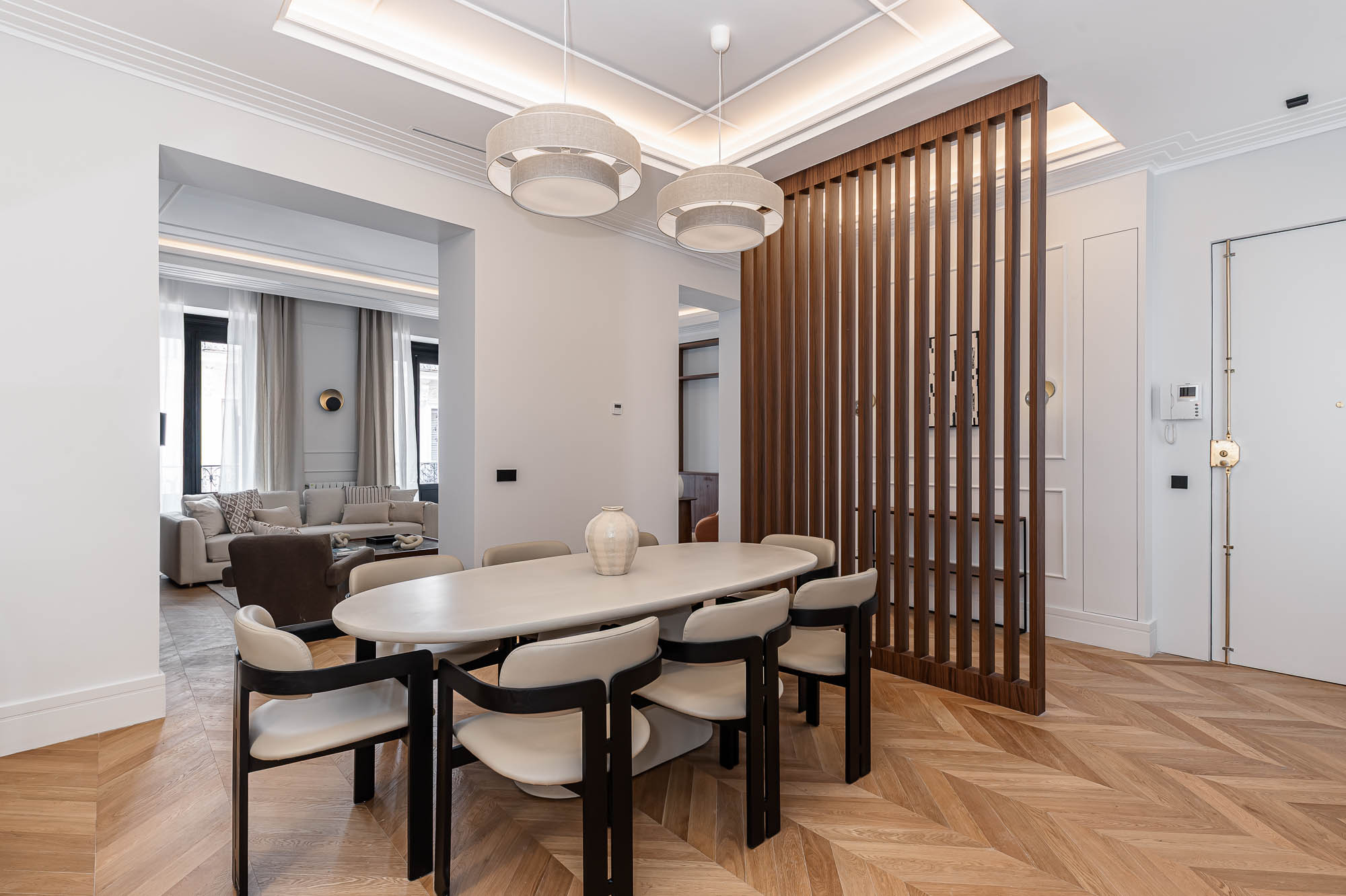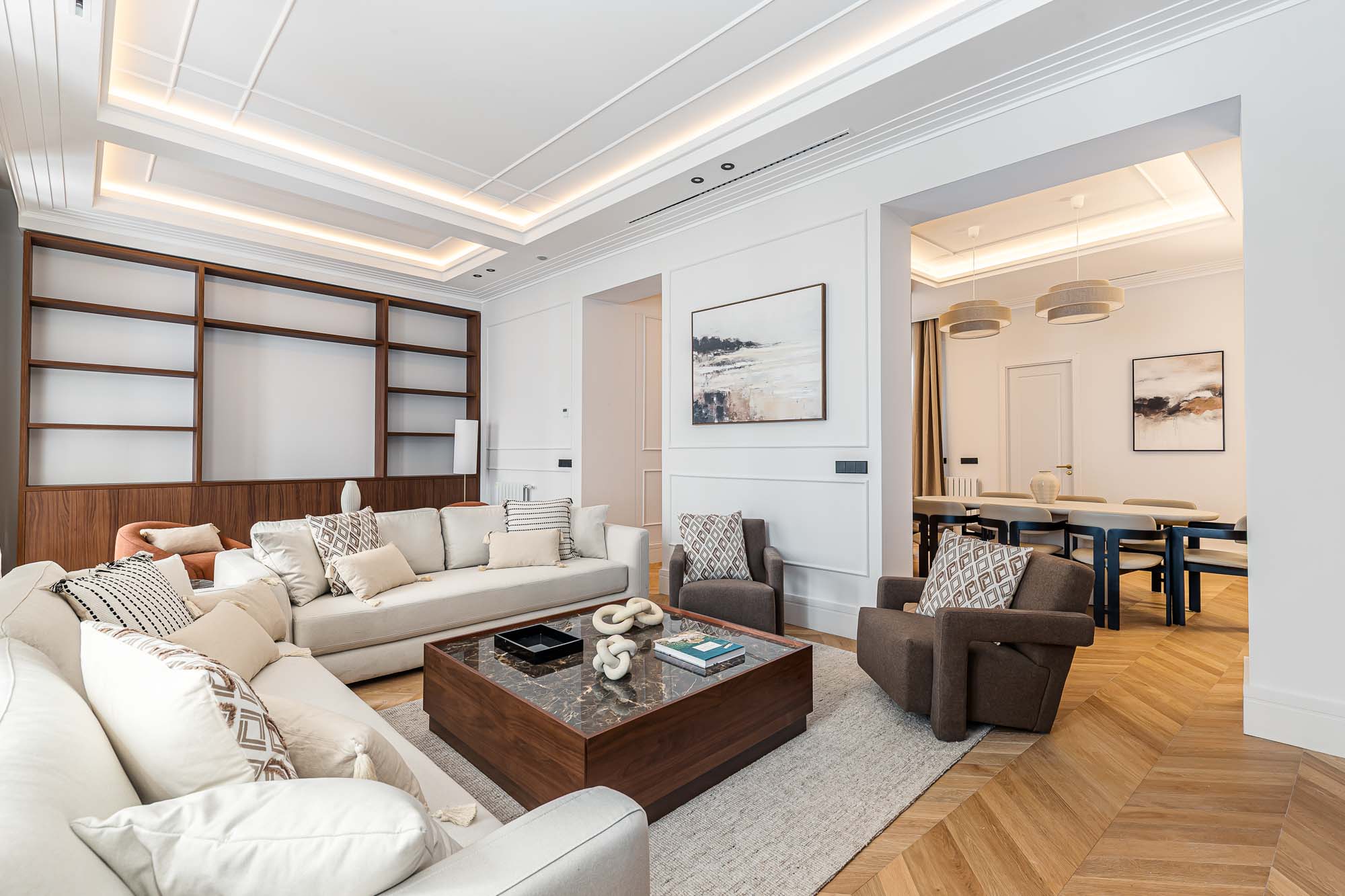 Los techos moldurados, las carpinterías a medida y la iluminación indirecta refuerzan la sensación de equilibrio y sofisticación en todo el conjunto.