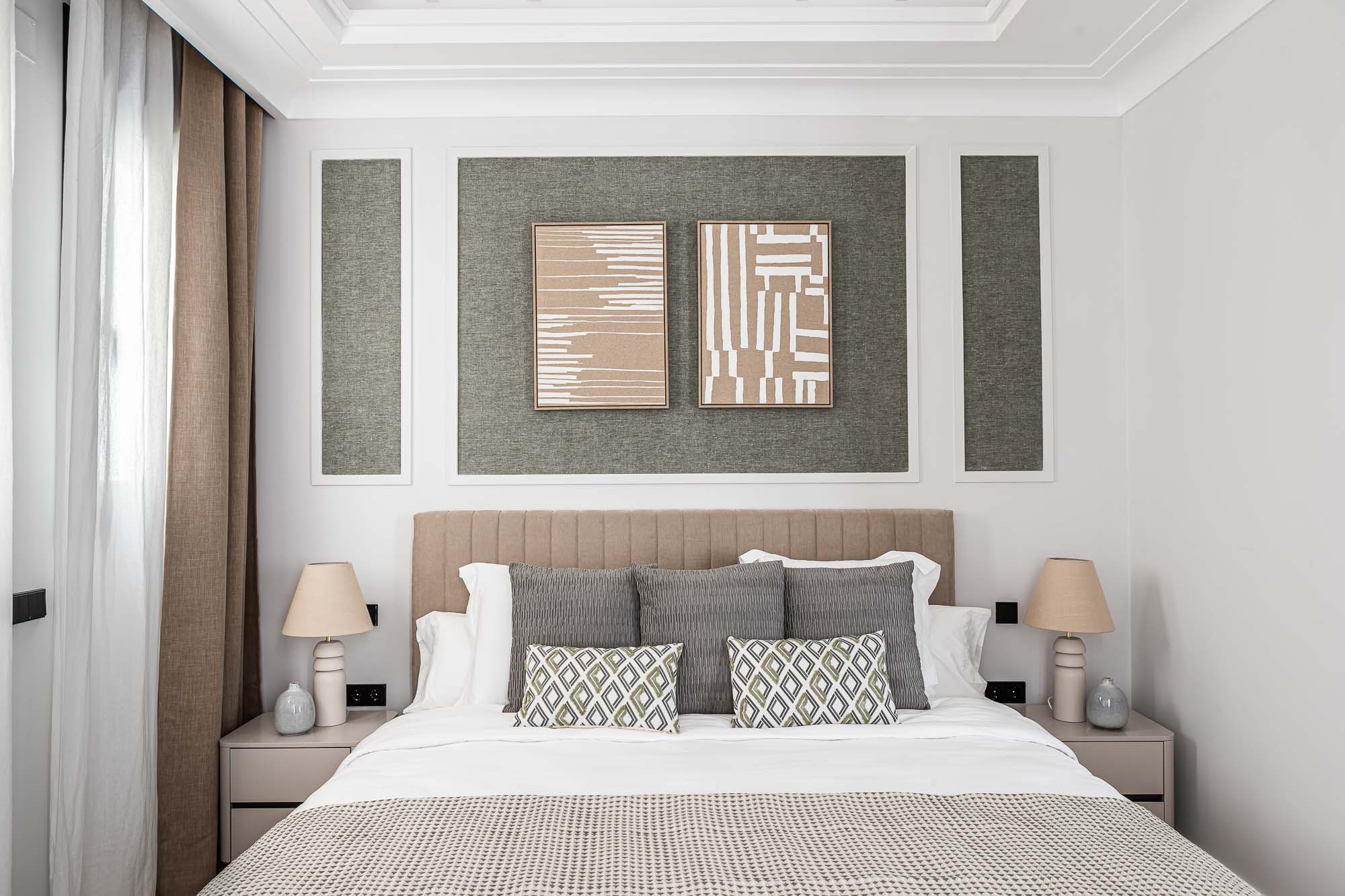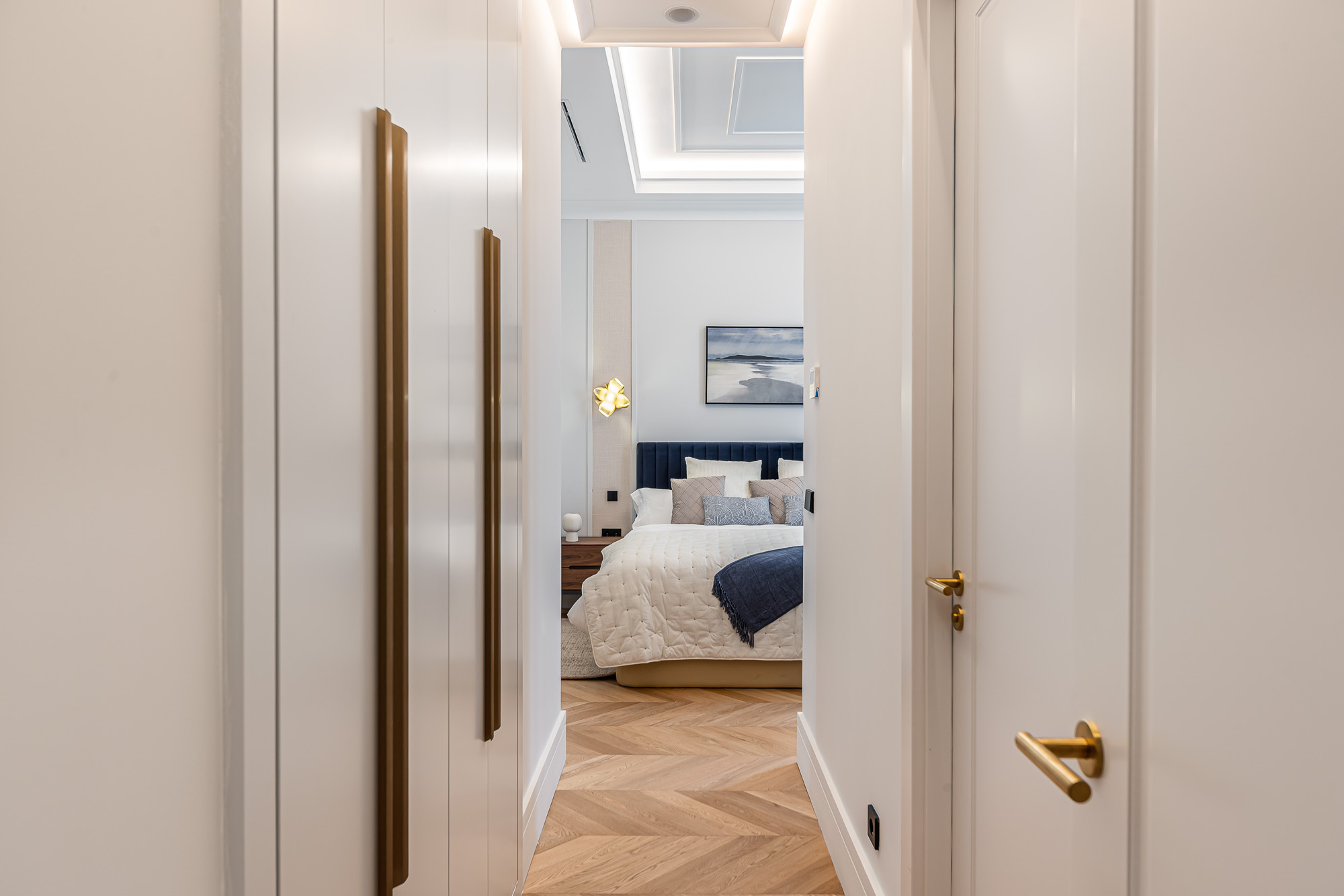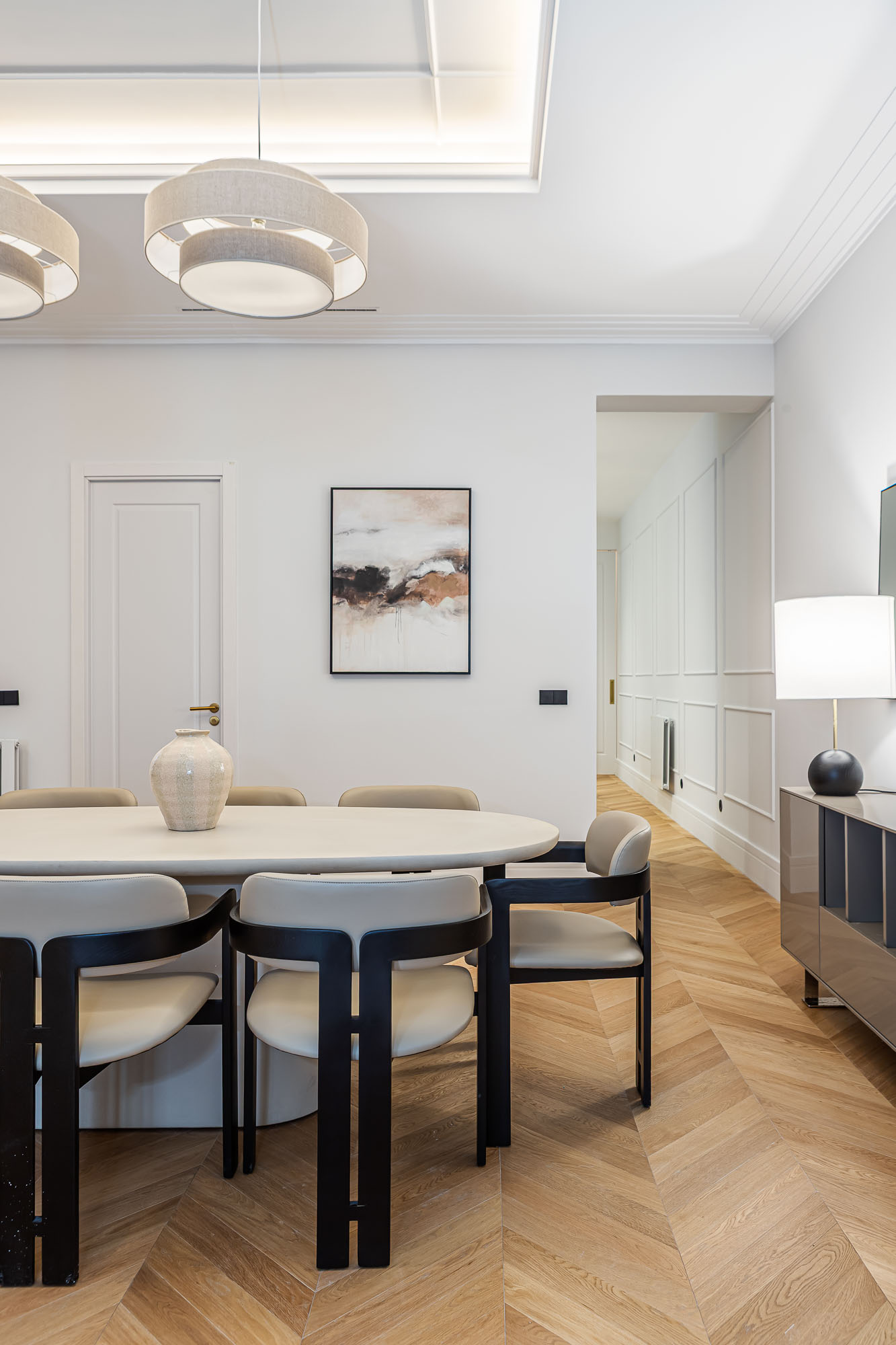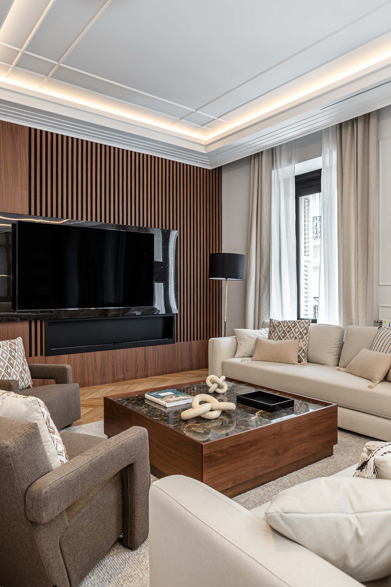 Los techos moldurados, las carpinterías a medida y la iluminación indirecta refuerzan la sensación de equilibrio y sofisticación en todo el conjunto.