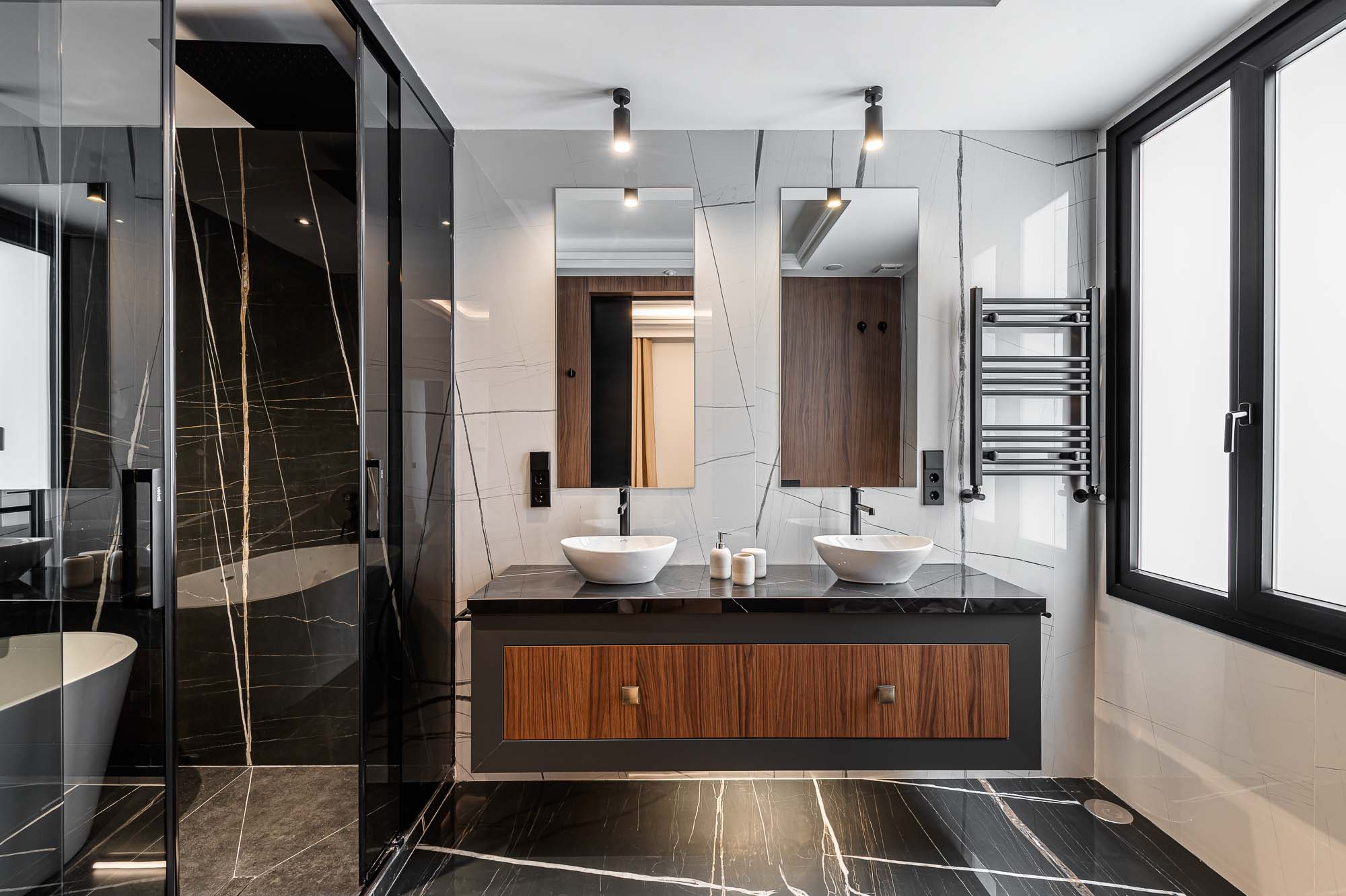 El diseño se centra en la armonía de materiales nobles, como la madera de nogal y el mármol, con una paleta neutra que resalta la luz natural y la amplitud de las estancias.